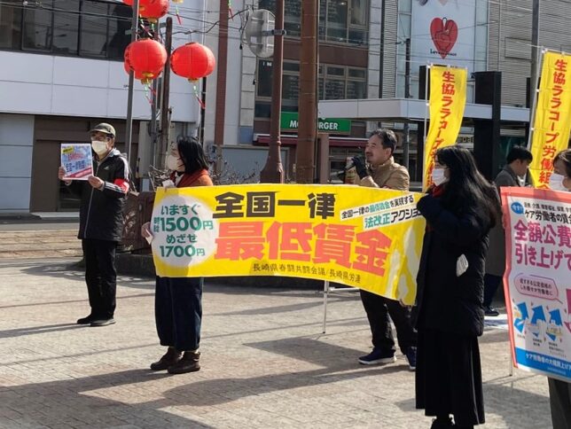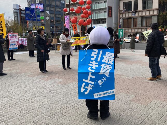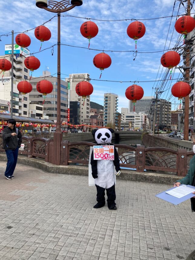 1月31日、長崎県労連はローカルビッグアクションを長崎市鉄橋で行いました。全体で20人ほどが参加、私たちの組合からは本部担当の他に、長崎支部長とパンダが参加しました。民主長崎県政をつくる会の筒井涼介知事候補も応援に駆け付け一緒にティッシュを配りました。近くで衆院選の宣伝をしていたれいわ新鮮組の方々からも「労働組合は頑張って!」と激励をいただきました。