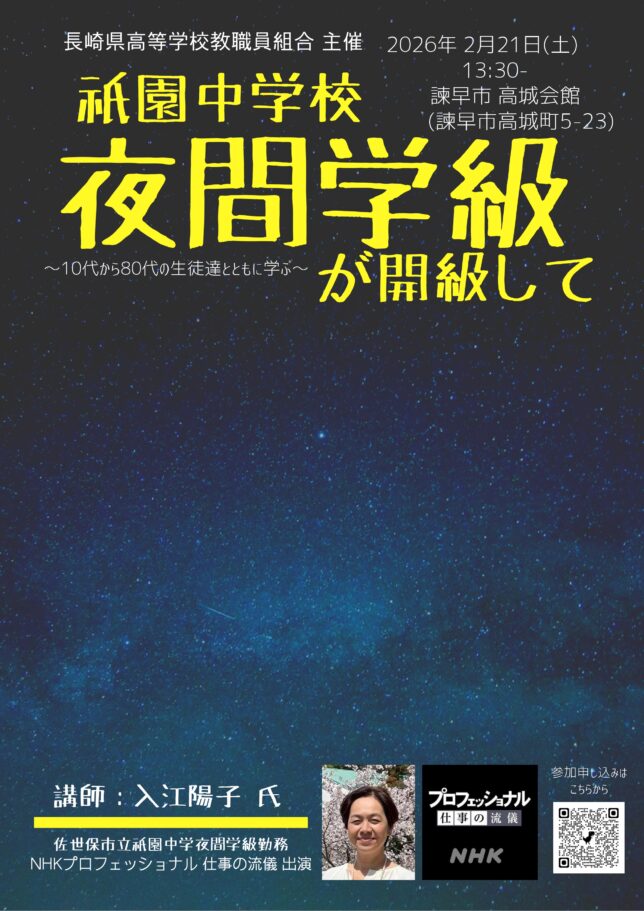 県高校教職員組合主催ですが、どなたでもお越しいただけます。教育関係者の皆様、保護者の皆様、地域の皆様、その他教育に関心のあられる方々ならどなたでも参加できます。ぜひお集まりください。もちろん夜間学級に入学を検討されている皆様も!