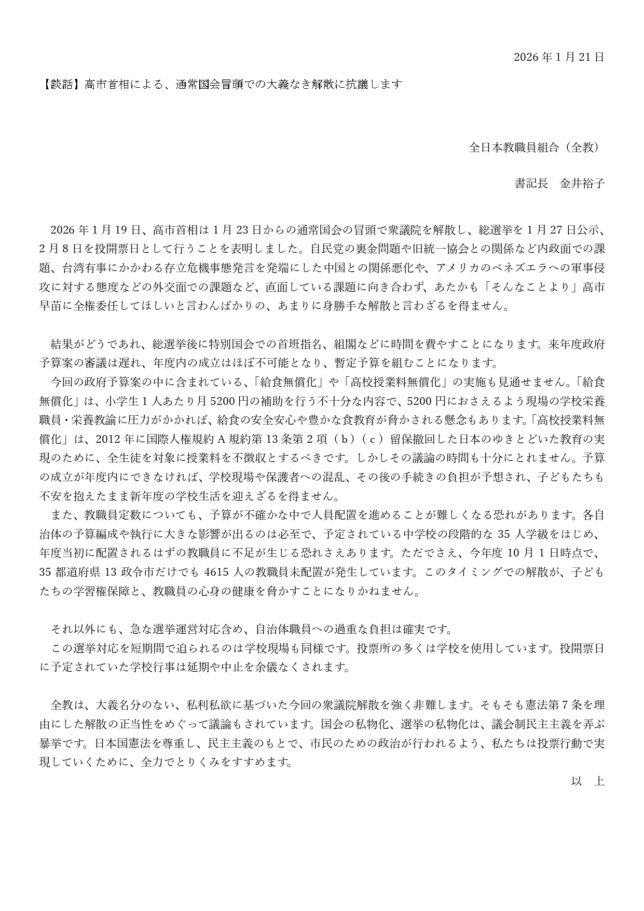 このことについての詳しい内容は、2月2日発行の高教組速報に記載していますので、そちらをご覧ください。