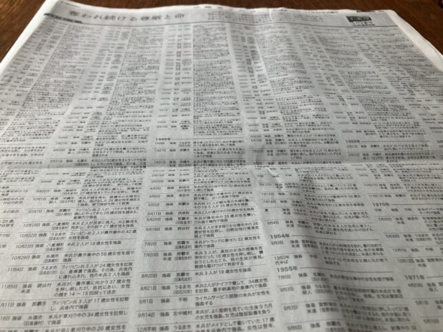 この日の沖縄タイムスは、テレビ欄をつぶして、沖縄戦から続く米兵の性暴力の長い年表を掲載しました。 被害者には9カ月の乳児も、58歳の女性も。米兵10人による犯行も。この年表は、本土の人こそ読むべきです。
