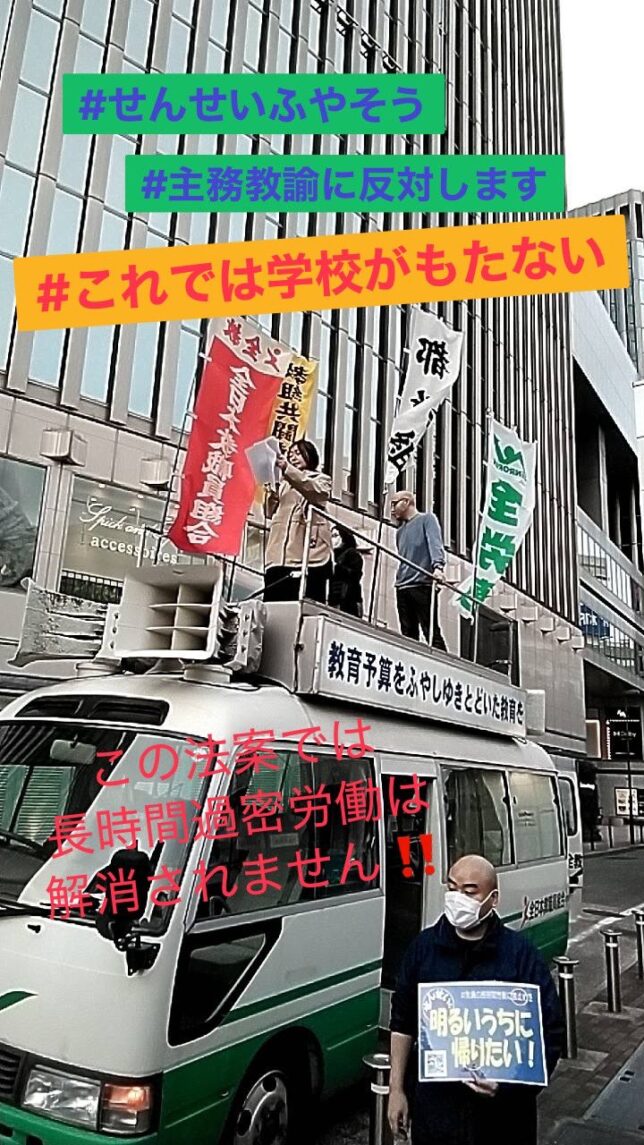 10日、国会で審議入りした給特法等改定案について、全教がその問題点を有楽町で街頭宣伝。「 政府の給特法等改定案の問題点をぜひ知ってください」「教職員の長時間過密労働の解消にまったくつながりません」「 なんのための法案改定でしょうか」