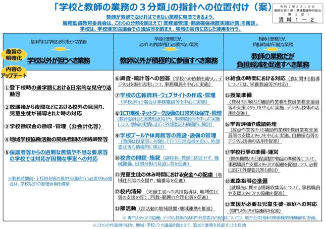 中央教育審議会初等中等教育分科会「教師を取り巻く環境整備特別部会」は、8月19日、いわゆる「業務の3分類」の改定案を示しました。教諭においては一定の負担軽減につながるものの、その業務を事務職員や実習教員などに置き換えることが促されており、人を増やさなければ同僚性に支障をきたす結果となり、そのことは逆に負担を増やすことにもなりかねません。教職員定数の抜本改善が必要です。