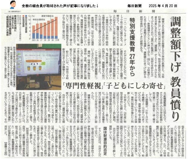 文科大臣は削減の理由として「インクルーシブ化が進み、特支学校・学級の特殊性が弱まった」と述べていますが、インクルーシブ化は、必要な施設設備が十分でないこともあって、地方では進んでいないという実態もあります。記者からの「教職調整額引き上げの財源ねん出のためか」との質問に対し文科大臣は「そうではない」と回答していますが、財務省から効率化を迫られ、引き上げの予算を確保できていない実情もあります。教員特別手当と同様で、財務省にアピールするための材料としての削減であることは明白です。